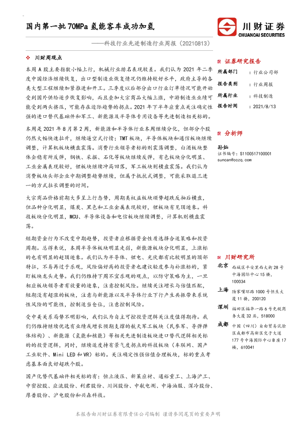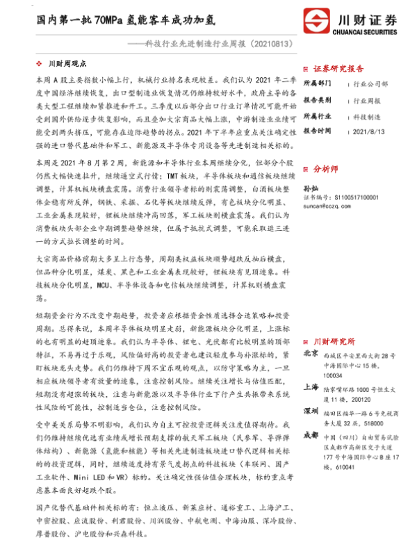 【川财证券】【20210813】科技行业先进制造行业周报:国内第一批70MPa氢能客车成功加氢-12页
