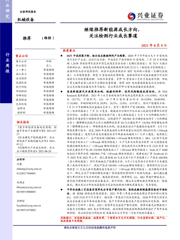 【兴业证券】【20210809】继续推荐新能源成长方向,关注检测行业成长赛道-25页