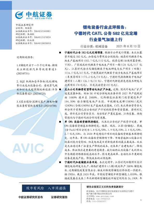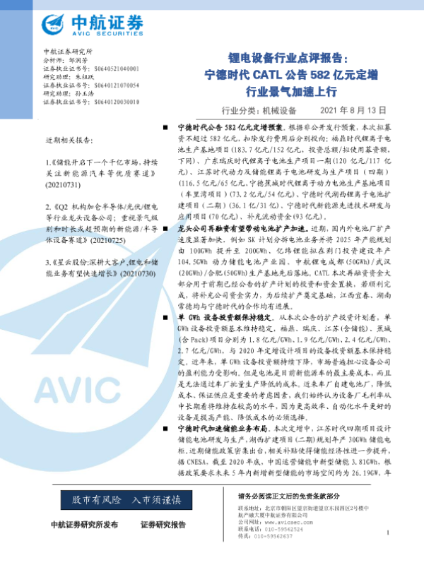 【中航证券】【20210813】锂电设备行业点评报告:宁德时代CATL公告582亿元定增行业景气加速上行-3页