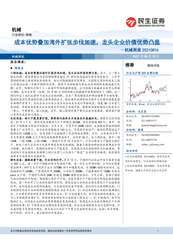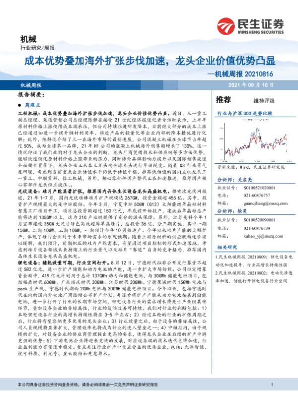 【民生证券】【20210816】20210816-民生证券-机械周报:成本优势叠加海外扩张步伐加速,龙头企业价值优势凸显-23页