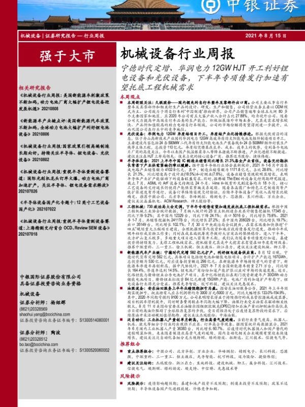 【中银证券】【20210815】机械设备行业周报:宁德时代定增、华润电力12GWHJT开工利好锂电设备和光伏设备,下半年专项债发行加速有望托底工程机械需求-15页