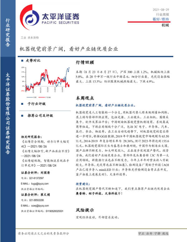 【太平洋证券】【20210829】20210829-太平洋-机械行业周报:机器视觉前景广阔,看好产业链优质企业-16页