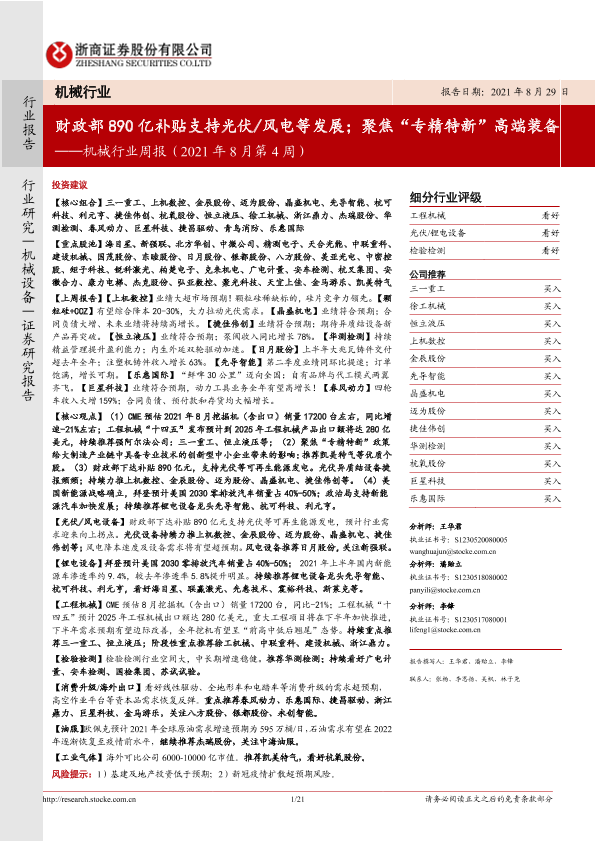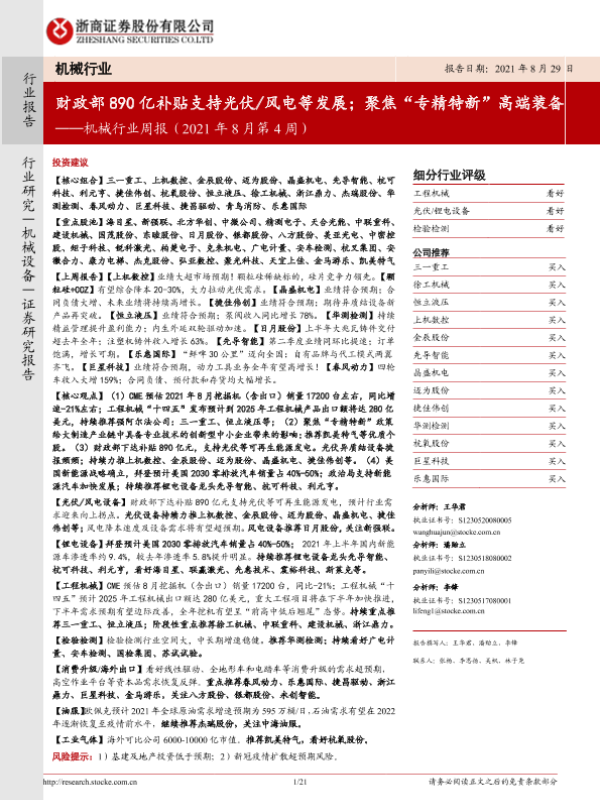【浙商证券】【20210829】机械行业周报(2021年8月第4周):财政部890亿补贴支持光伏风电等发展;聚焦“专精特新”高端装备-21页
