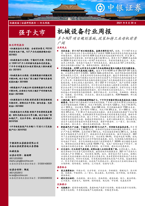 【中银证券】【20210830】机械设备行业周报:多个HJT项目规划落地,政策加持工业母机前景广阔-15页