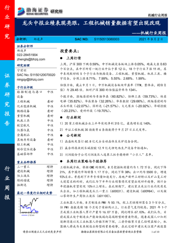 【渤海证券】【20210902】机械行业周报:龙头中报业绩表现亮眼,工程机械销量数据有望出现改观-10页
