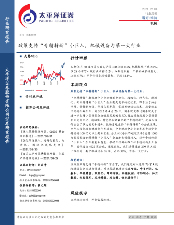 【太平洋证券】【20210904】20210904-太平洋-机械行业周报:政策支持“专精特新”小巨人,机械设备为第一大行业-16页