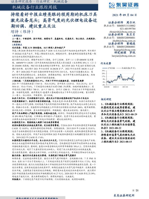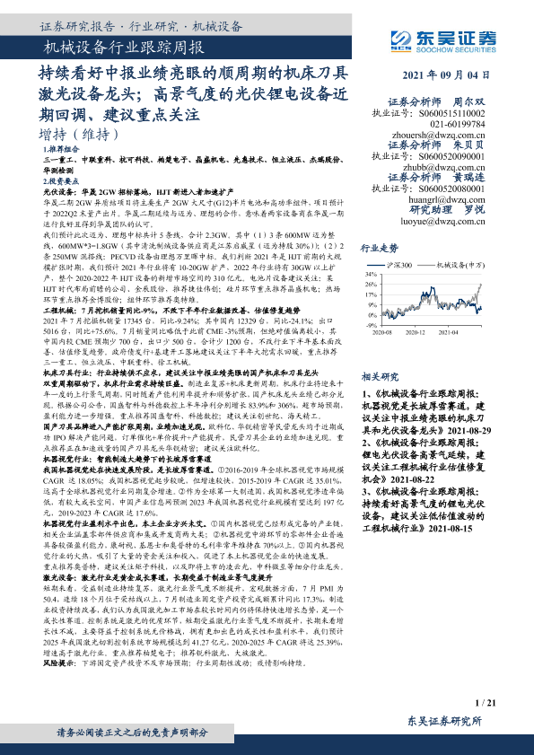 【东吴证券】【20210904】20210904-东吴证券-机械设备行业跟踪周报:持续看好中报业绩亮眼的顺周期的机床刀具激光设备龙头;高景气度的光伏锂电设备近期回调、建议重点关注-21页