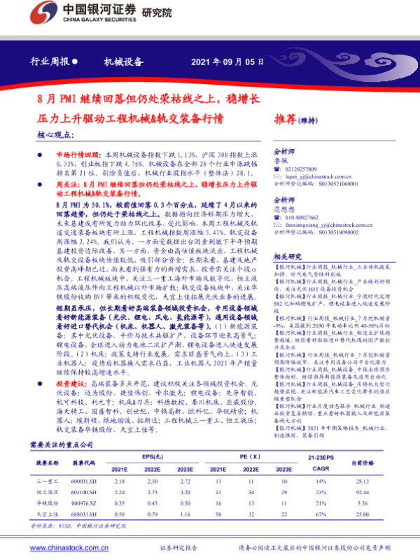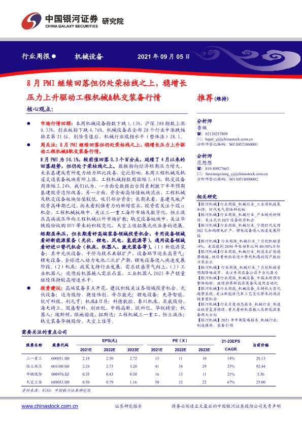 【银河证券】【20210905】20210905-中国银河-机械设备行业周报:8月PMI继续回落但仍处荣枯线之上,稳增长压力上升驱动工程机械&轨交装备行情-14页