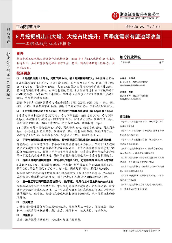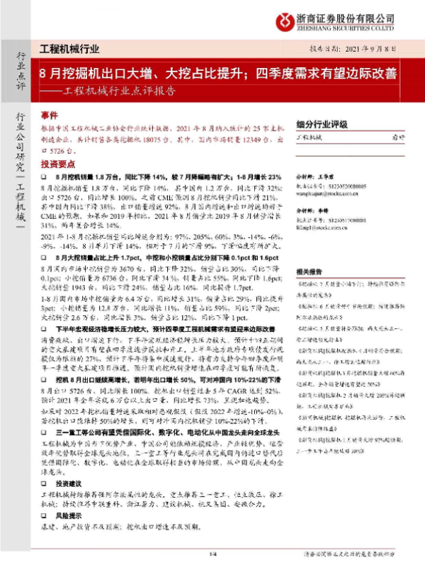 【浙商证券】【20210908】20210908-浙商证券-工程机械行业点评报告:8月挖掘机出口大增、大挖占比提升;四季度需求有望边际改善-4页