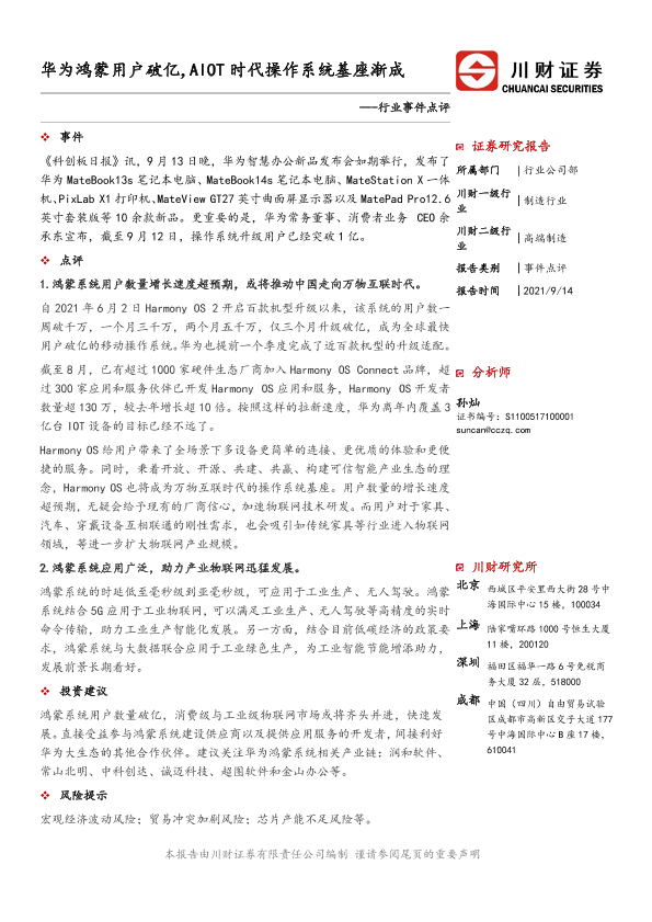 【川财证券】【20210914】高端制造行业事件点评:华为鸿蒙用户破亿,AIOT时代操作系统基座渐成-2页
