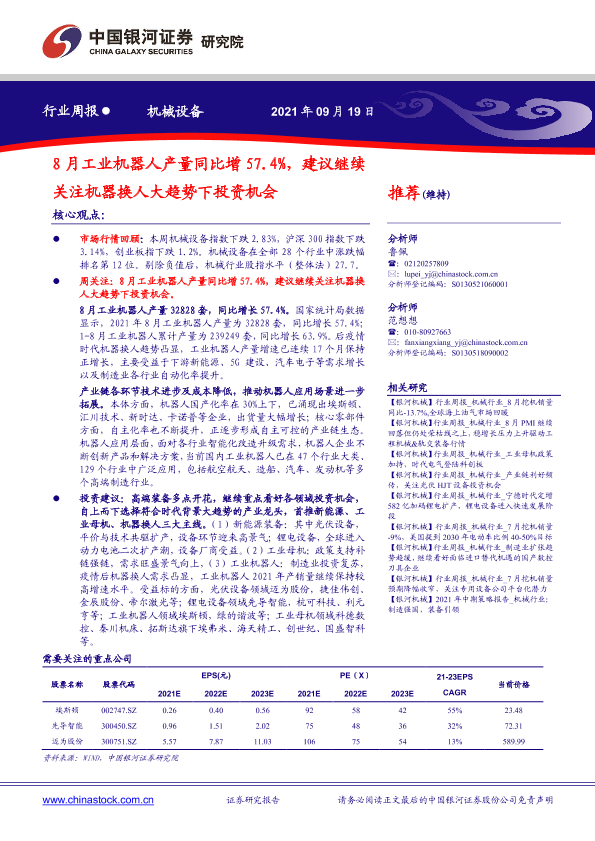 【银河证券】【20210919】20210919-中国银河-机械设备行业周报:8月工业机器人产量同比增57.4%,建议继续关注机器换人大趋势下投资机会-15页
