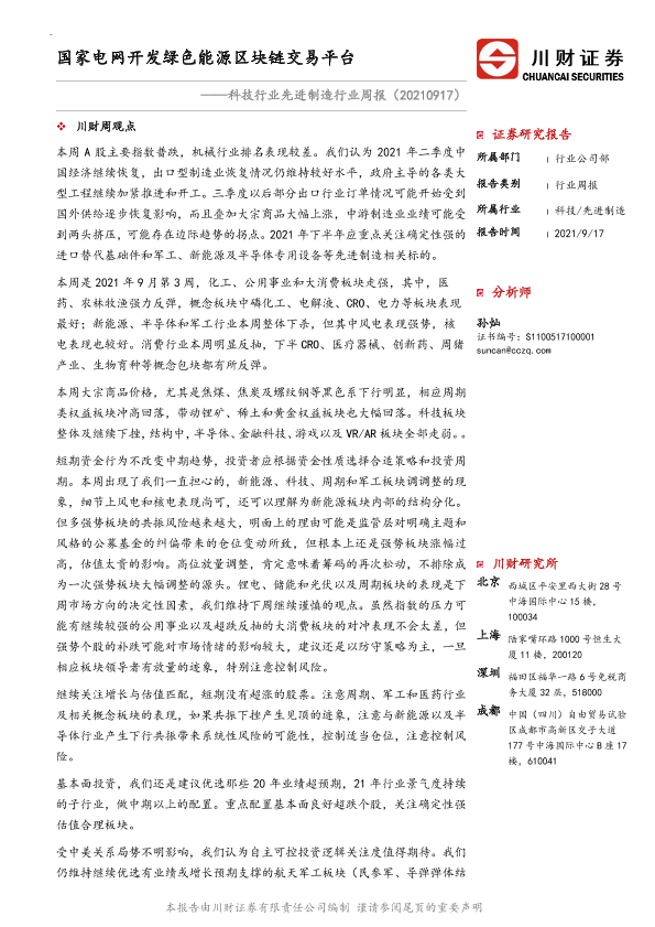 【川财证券】【20210917】科技行业先进制造行业周报:国家电网开发绿色能源区块链交易平台-11页