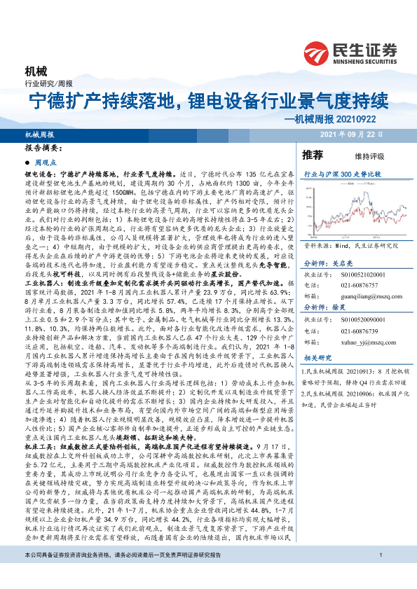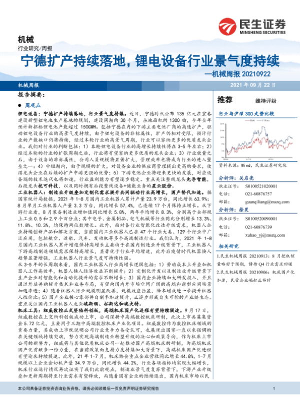 【民生证券】【20210922】20210922-民生证券-机械周报:宁德扩产持续落地,锂电设备行业景气度持续-20页