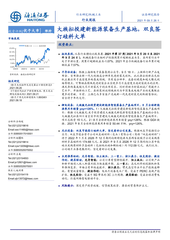 【海通证券】【20210926】机械工业行业周报:大族拟投建新能源装备生产基地,双良签订硅料大单-10页