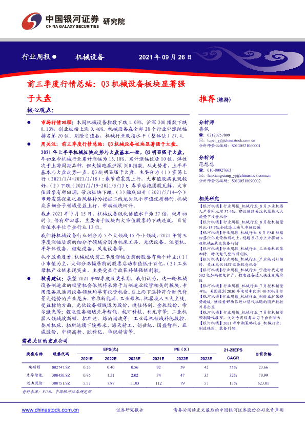 【银河证券】【20210926】20210926-中国银河-机械设备行业周报:前三季度行情总结:Q3机械设备板块显著强于大盘-15页