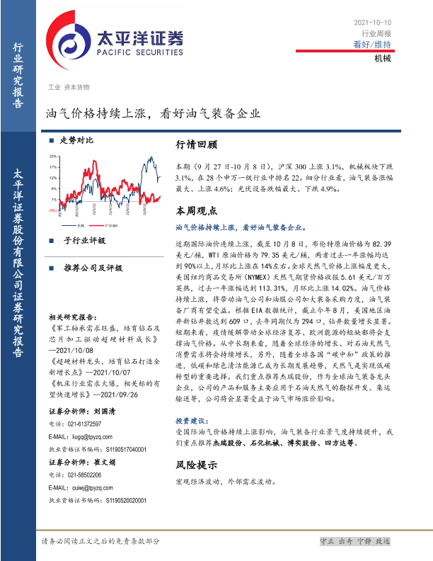 【太平洋证券】【20211010】20211010-太平洋-机械行业周报:油气价格持续上涨,看好油气装备企业-15页
