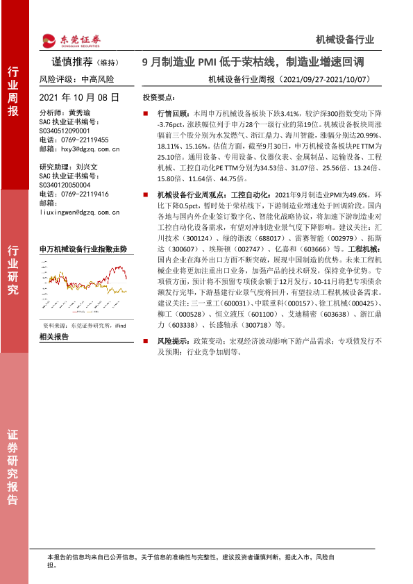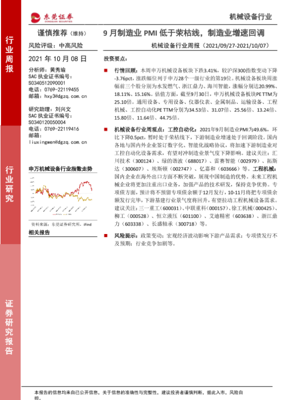 【东莞证券】【20211008】20211008-东莞证券-机械设备行业周报:9月制造业PMI低于荣枯线,制造业增速回调-12页