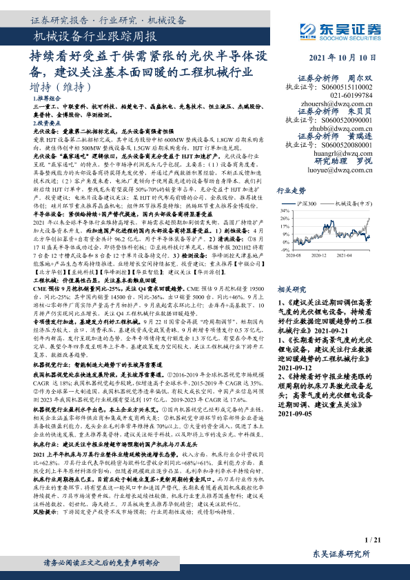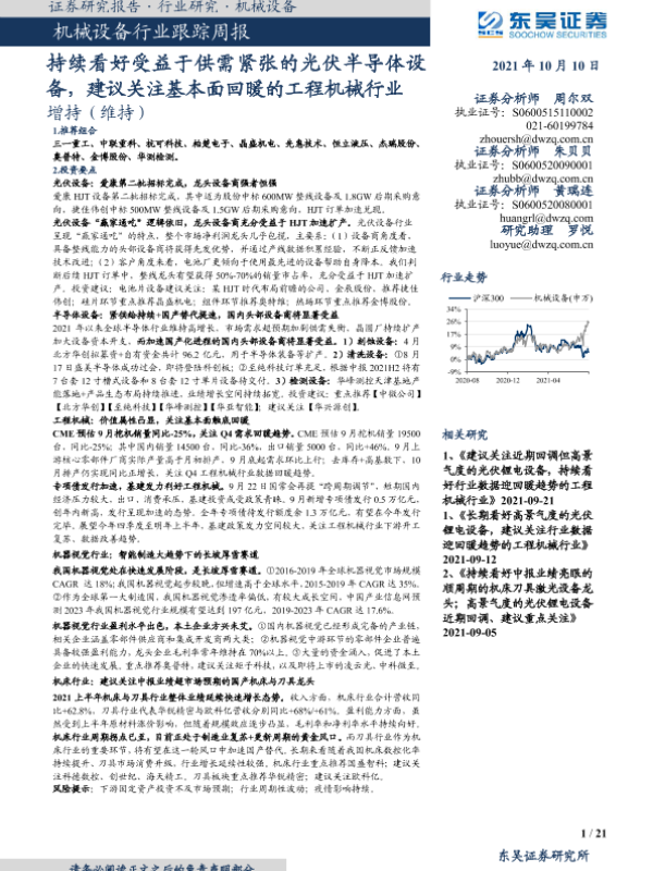 【东吴证券】【20211010】20211010-东吴证券-机械设备行业跟踪周报:持续看好受益于供需紧张的光伏半导体设备,建议关注基本面回暖的工程机械行业-21页