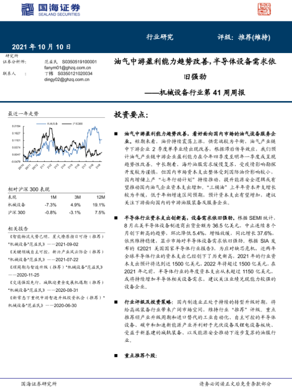 【国海证券】【20211010】20211010-国海证券-机械设备行业第41周周报:油气中游盈利能力趋势改善,半导体设备需求依旧强劲-19页