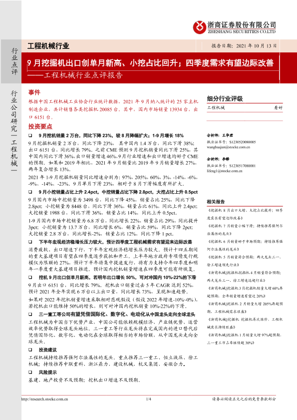 【浙商证券】【20211013】20211013-浙商证券-工程机械行业点评报告:9月挖掘机出口创单月新高、小挖占比回升;四季度需求有望边际改善-4页