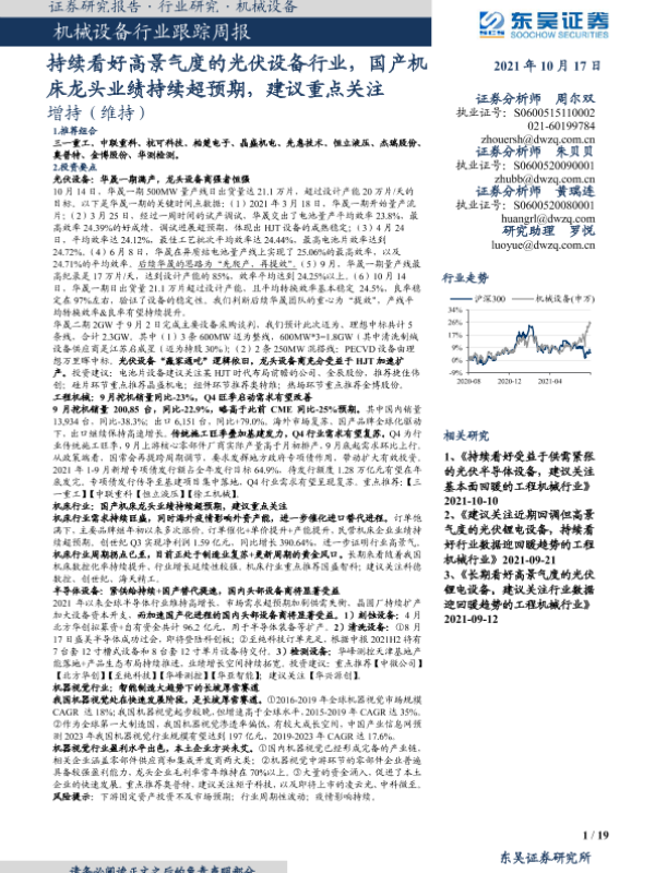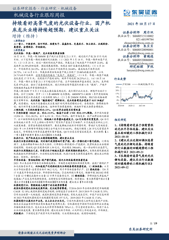 【东吴证券】【20211017】20211017-东吴证券-机械设备行业跟踪周报:持续看好高景气度的光伏设备行业,国产机床龙头业绩持续超预期,建议重点关注-19页