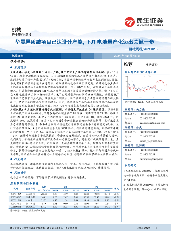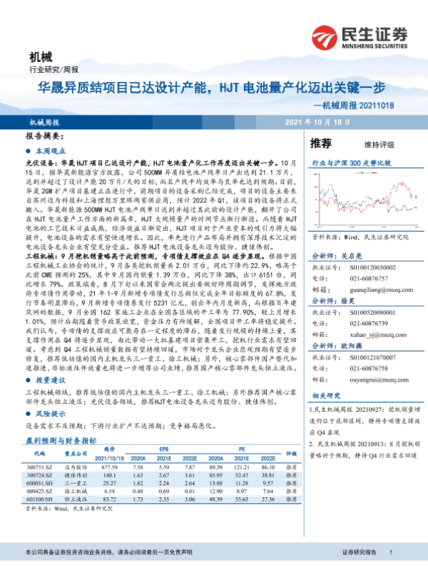 【民生证券】【20211018】机械周报:华晟异质结项目已达设计产能,HJT电池量产化迈出关键一步-20页