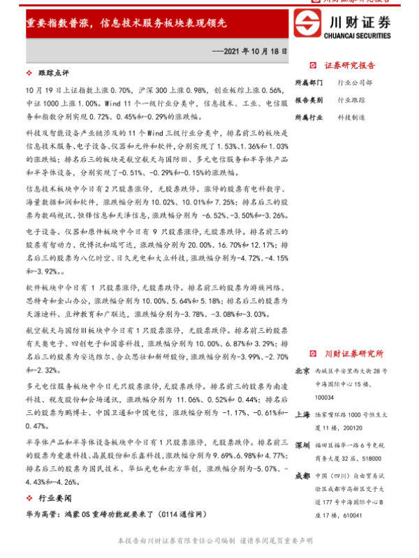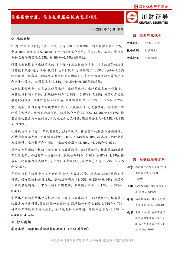 【川财证券】【20211019】科技制造行业跟踪:重要指数普涨,信息技术服务板块表现领先-6页