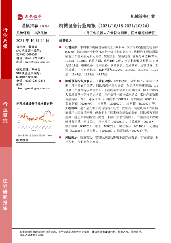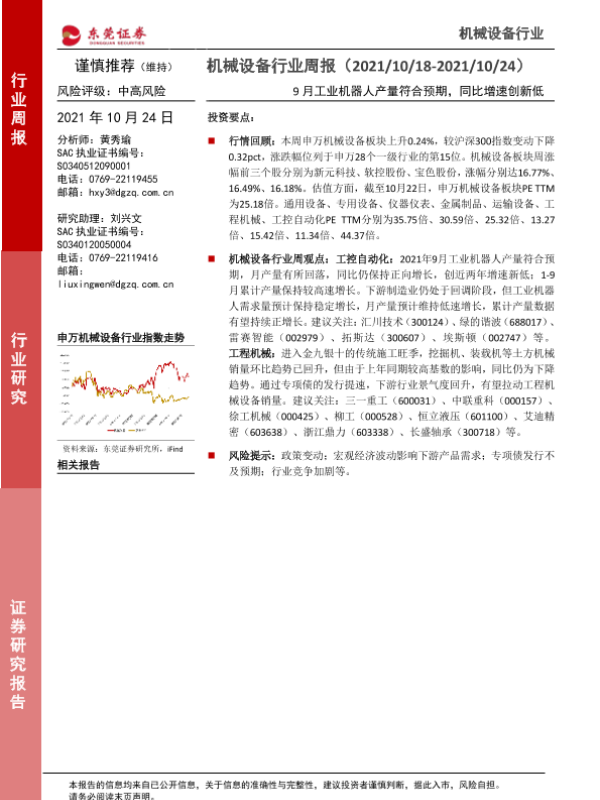 【东莞证券】【20211024】20211024-东莞证券-机械设备行业周报:9月工业机器人产量符合预期,同比增速创新低-12页