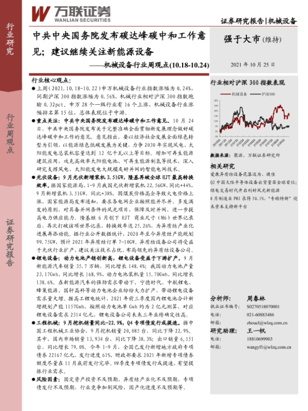 【万联证券】【20211025】20211025-万联证券-机械设备行业周观点:中共中央国务院发布碳达峰碳中和工作意见;建议继续关注新能源设备-12页