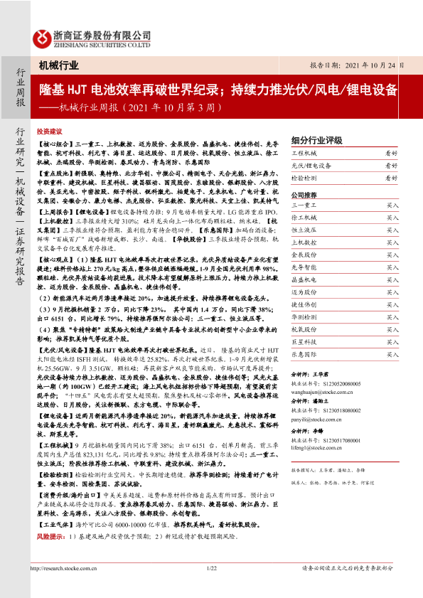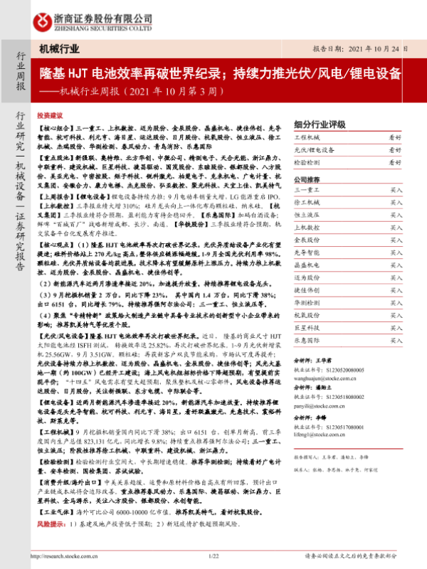 【浙商证券】【20211024】机械行业周报(2021年10月第3周):隆基HJT电池效率再破世界纪录;持续力推光伏 风电 锂电设备-22页
