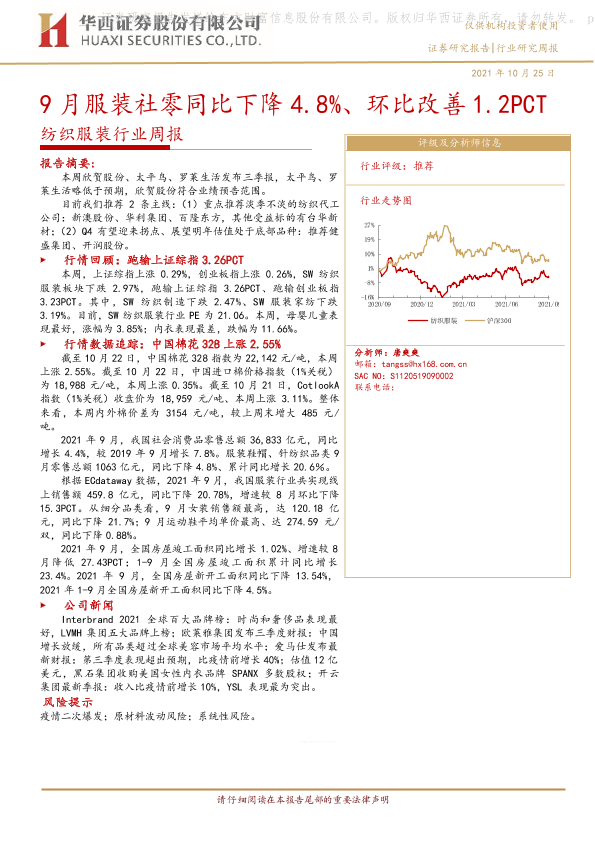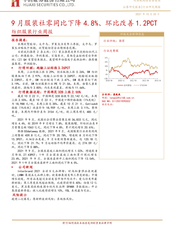 【华西证券】【20211025】20211025-华西证券-纺织服装行业周报:9月服装社零同比下降4.8%、环比改善1.2PCT-20页