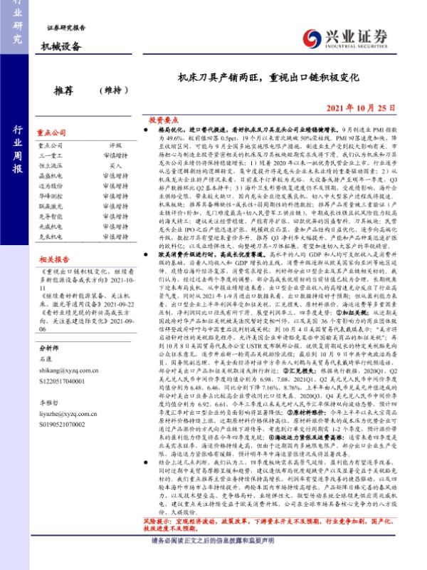 【兴业证券】【20211025】20211025-兴业证券-机械设备行业周报:机床刀具产销两旺,重视出口链积极变化-26页