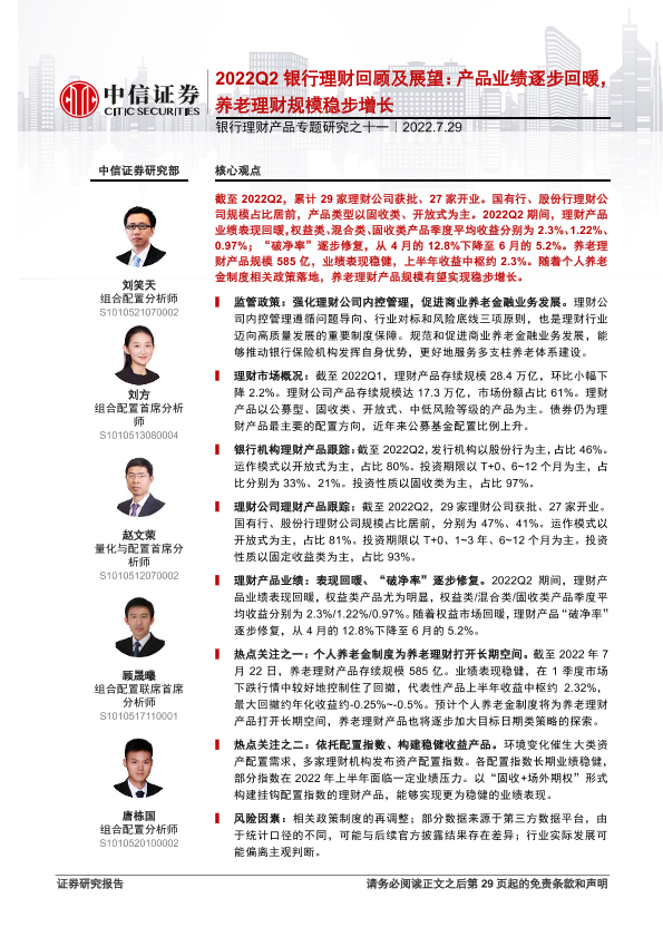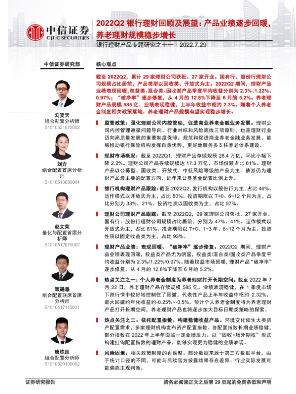 【中信证券】【20220729】2022Q2银行理财回顾及展望:产品业绩逐步回暖,养老理财规模稳步增长-30页