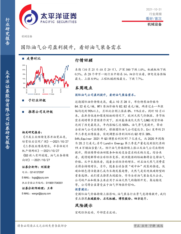 【太平洋证券】【20211031】20211031-太平洋-机械设备行业周报:国际油气公司盈利提升,看好油气装备需求-14页