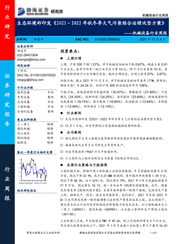 【渤海证券】【20211104】20211104-渤海证券-机械设备行业周报:生态环境部印发《2021-2022年秋冬季大气污染综合治理攻坚方案》-9页