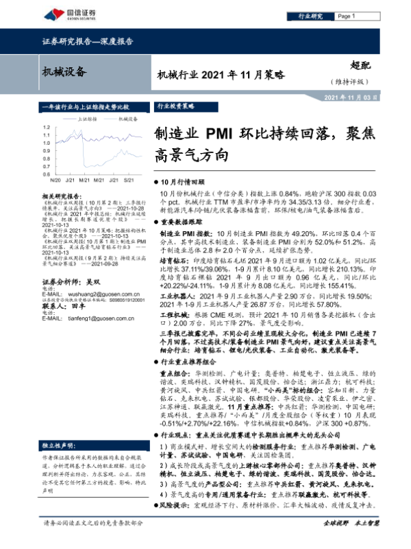【国信证券】【20211103】机械行业2021年11月策略:制造业PMI环比持续回落,聚焦高景气方向-19页