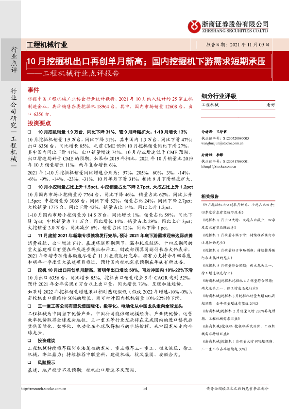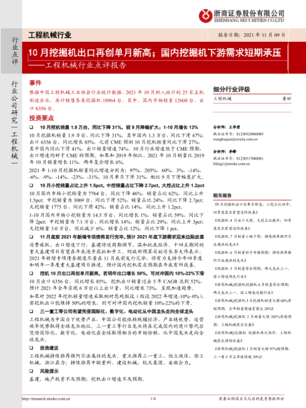 【浙商证券】【20211109】20211109-浙商证券-工程机械行业点评报告:10月挖掘机出口再创单月新高;国内挖掘机下游需求短期承压-4页