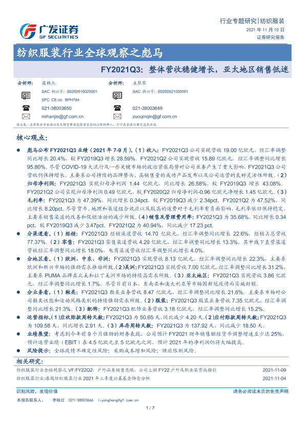 【广发证券】【20211110】纺织服装行业全球观察之彪马:FY2021Q3:整体营收稳健增长,亚太地区销售低迷-7页