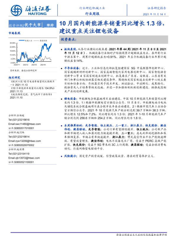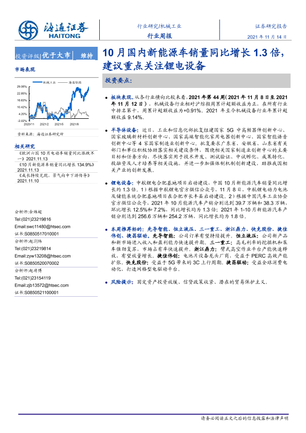 【海通证券】【20211114】20211114-海通证券-机械工业行业周报:10月国内新能源车销量同比增长1.3倍,建议重点关注锂电设备-10页