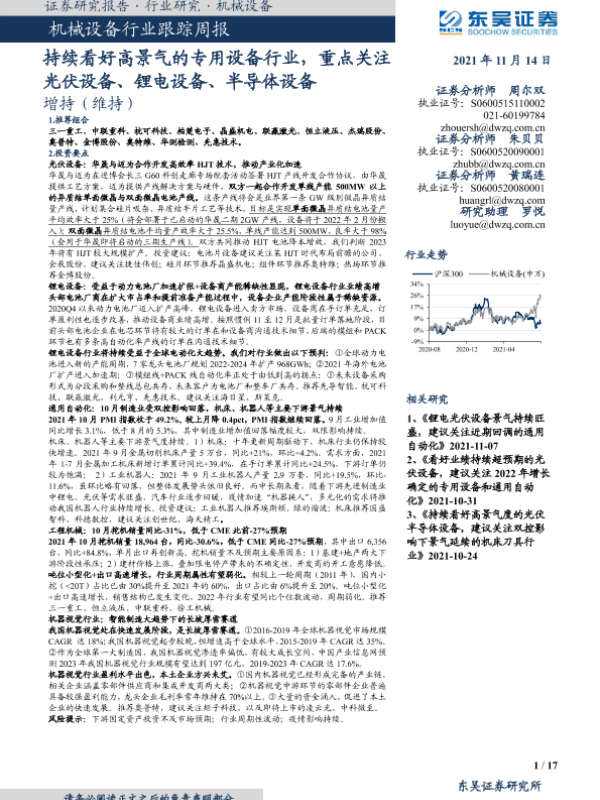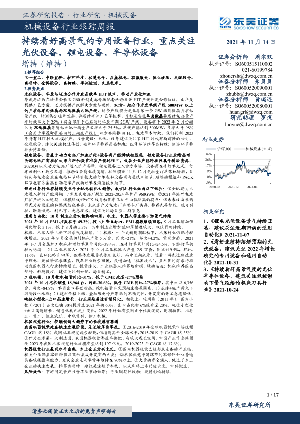 【东吴证券】【20211114】20211114-东吴证券-机械设备行业跟踪周报:持续看好高景气的专用设备行业,重点关注光伏设备、锂电设备、半导体设备-17页
