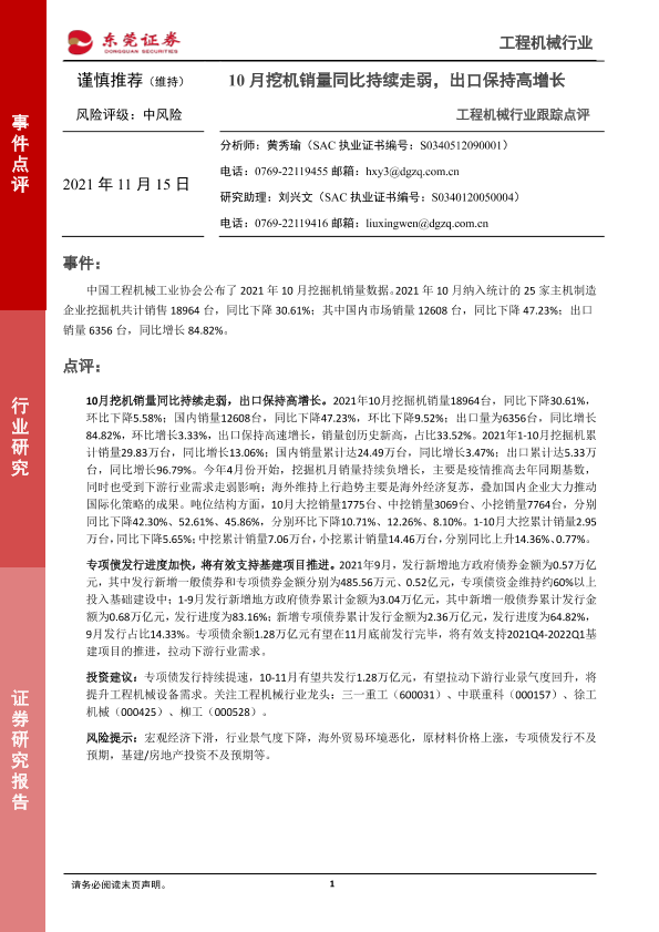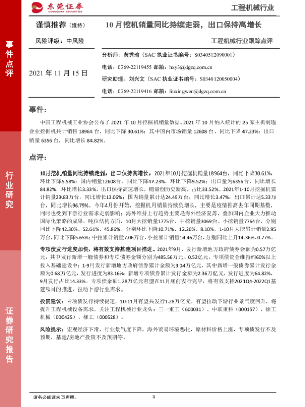 【东莞证券】【20211115】20211115-东莞证券-工程机械行业跟踪点评:10月挖机销量同比持续走弱,出口保持高增长-3页