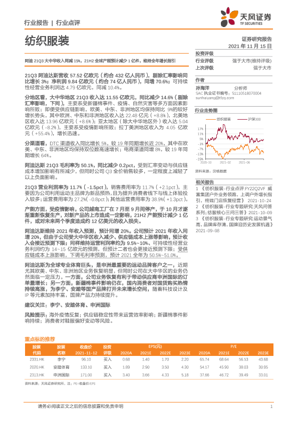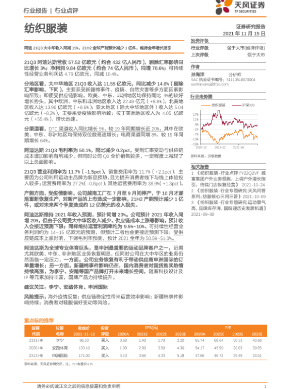 【天风证券】【20211115】纺织服装行业点评:阿迪21Q3大中华收入同减15%,21H2全球产能预计减少1亿件,维持全年增长指引-2页