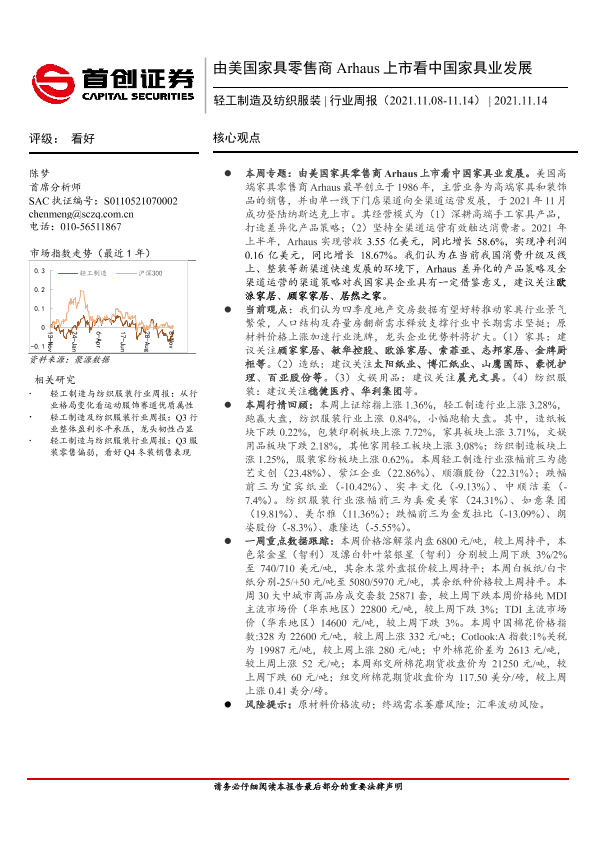 【首创证券】【20211114】20211114-首创证券-轻工制造及纺织服装行业周报:由美国家具零售商Arhaus上市看中国家具业发展-18页