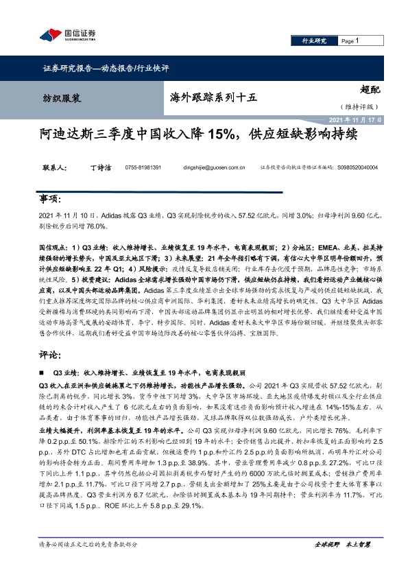 【国信证券】【20211117】纺织服装海外跟踪系列十五:阿迪达斯三季度中国收入降15%,供应短缺影响持续-11页