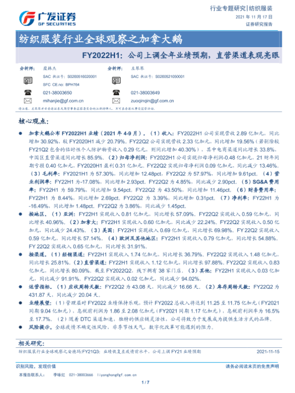 【广发证券】【20211117】纺织服装行业全球观察之加拿大鹅:FY2022H1:公司上调全年业绩预期,直营渠道表现亮眼-7页