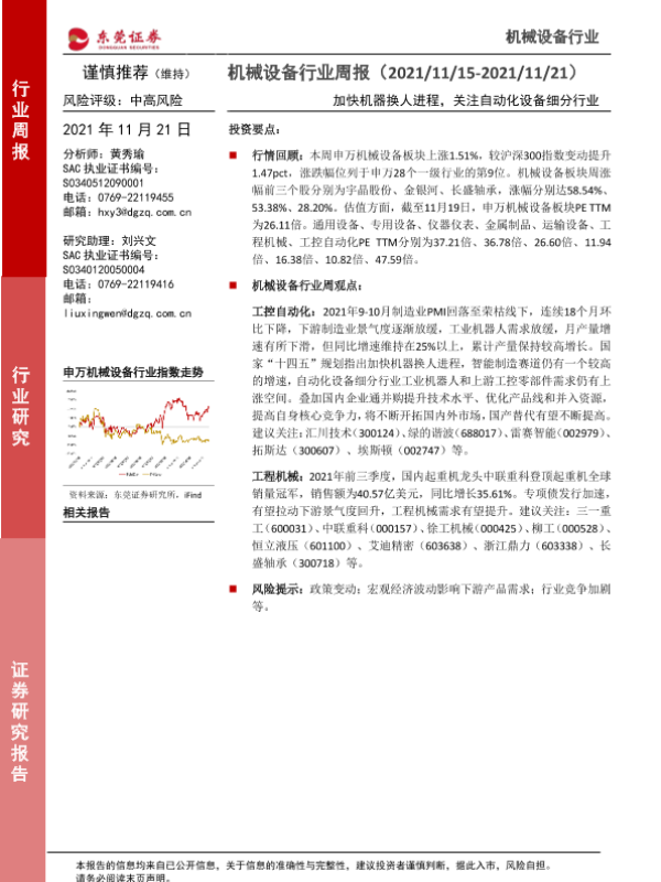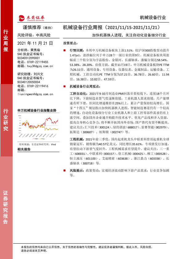 【东莞证券】【20211121】20211121-东莞证券-机械设备行业周报:加快机器换人进程,关注自动化设备细分行业-12页