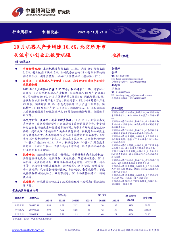 【银河证券】【20211121】20211121-中国银河-机械设备行业周报:10月机器人产量增速10.6%,北交所开市关注中小创企业投资机遇-16页