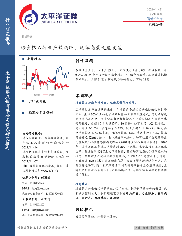【太平洋证券】【20211121】20211121-太平洋-机械设备行业周报:培育钻石行业产销两旺,延续高景气度发展-15页