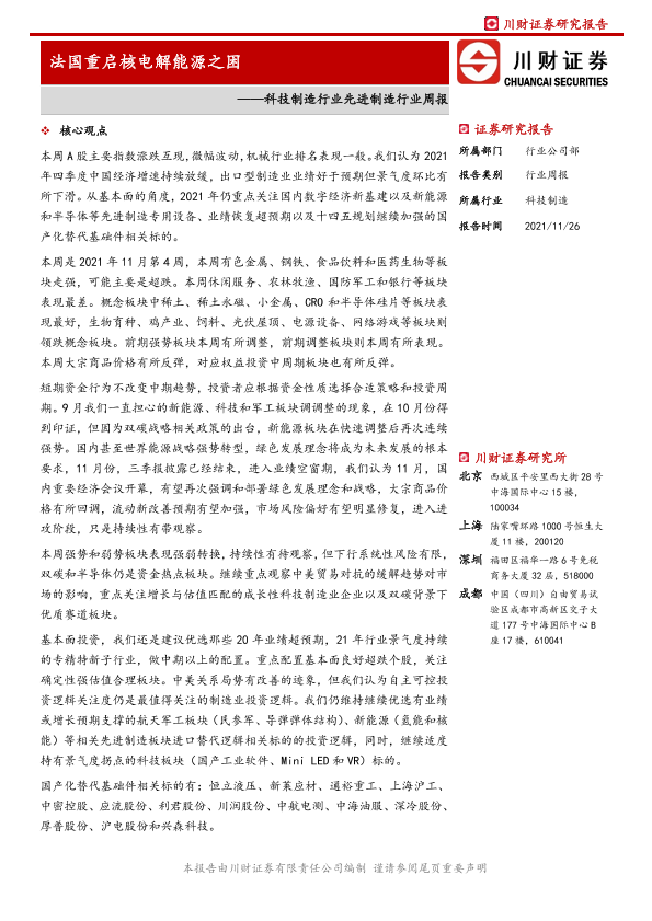 【川财证券】【20211126】科技制造行业先进制造行业周报:法国重启核电解能源之困-11页