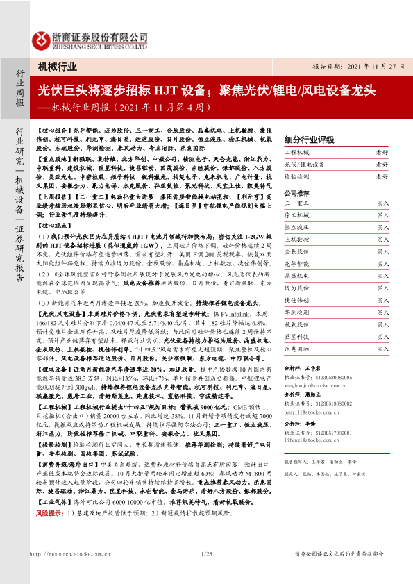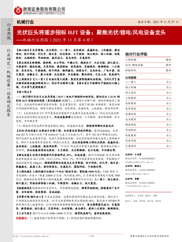 【浙商证券】【20211127】机械行业周报(2021年11月第4周):光伏巨头将逐步招标HJT设备;聚焦光伏/锂电/风电设备龙头-28页